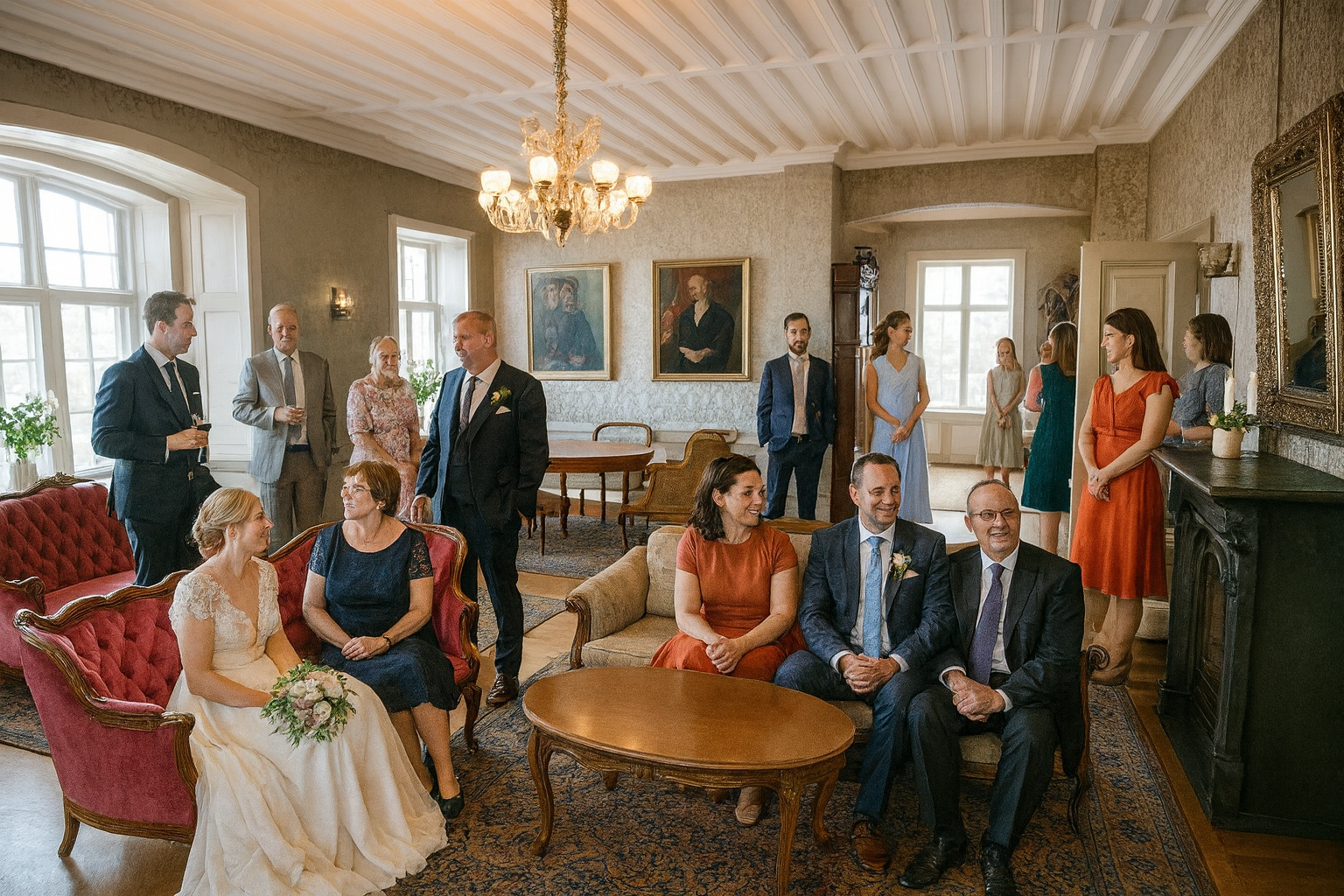 De høye takene, lysekronene og den varme fargepaletten gir en atmosfære av eventyr og klassisk eleganse. Utenfor omfavnes slottet av grønne områder og historiske detaljer – perfekt for bryllupsbilder i naturlig lys.