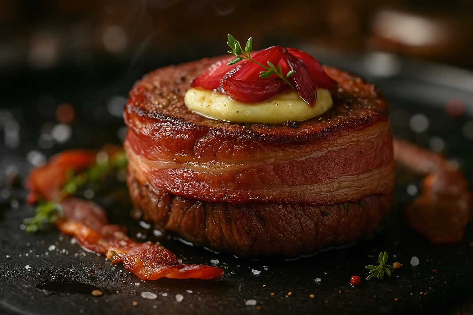 Nyt en utsøkt rett hvor mørt hjortekjøtt møter den rike smaken av bacon. Hjortefilet surret i bacon gir en perfekt balanse mellom saftighet og smak. Den kremede sellerirotkremen tilfører en delikat sødme, mens røstipoteten gir en sprø kontrast. Toppet med en fyldig steinsoppsaus, blir denne retten en kulinarisk opplevelse uten like.