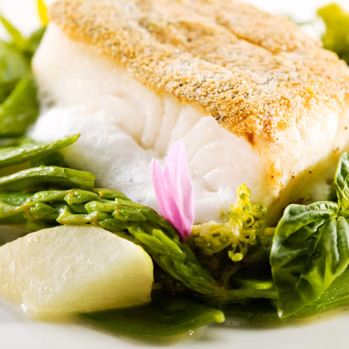 Opplev en utsøkt smakskombinasjon med vår kveiterett, hvor den delikate fisken harmonerer med en fyldig saus av baconsmør. Saftig kveite er perfekt tilberedt og akkompagnert av sprø savoykål, som tilfører en subtil sødme. De ristede sjalottløkene gir en karamellisert dybde, mens mandlene tilfører en knasende tekstur som kompletterer retten.