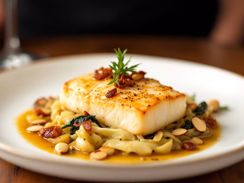 Kveite med Savoykål, Ristede Sjalottløk og Mandler, Servert med Baconsmør
