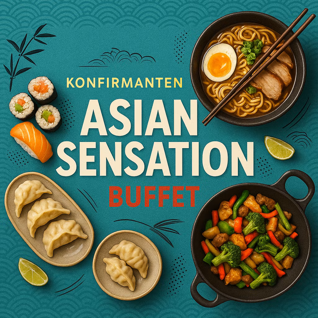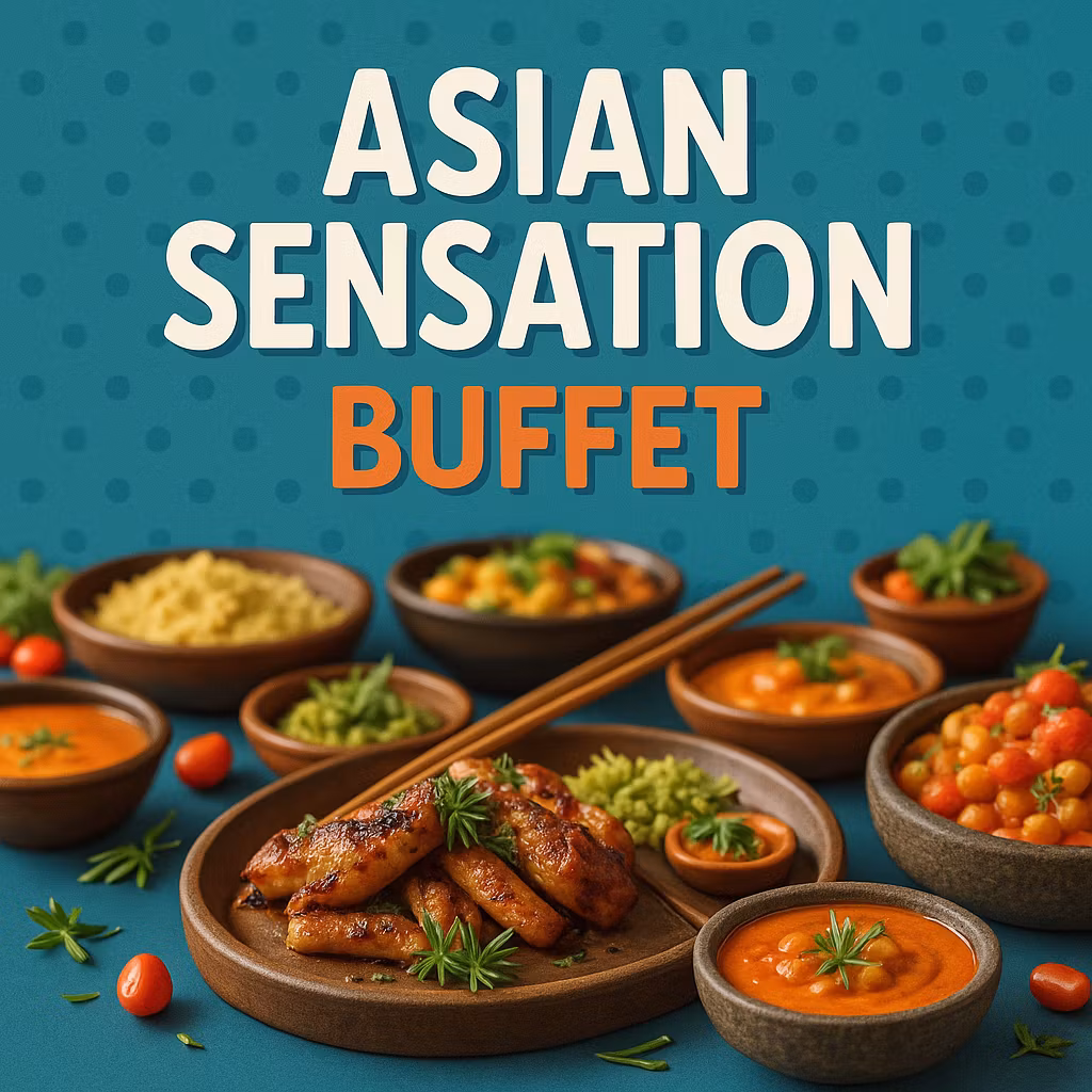 · KORIANSKE DUMPLINGS MED SVINEKJØTT OG GYOZA SAUS (pasta fylt med koreansk krydret svinekjøtt servert med mild soyasaus) · SATAY KYLLINGSPYD MED PEANØTTSAUS (marinert grillet kylling på spyd med peanøttsaus) · DIM SUM MED SVINEKJØTT (steamede buns fylt med smakfull krydret svinekjøtt) · BIFF CHOP SUEY (Kinesisk gryte med oksekjøtt, bambusskudd, sopp og vann kastanjer) · BUTTER CHICKEN (Kylling marinerte i yoghurt, honning, ingefær, chili, hvitløk og koriander) · VÅRRULLER MED KYLLING OG SWEET CHILI (tradisjonelle vårruller fylt med kylling og grønnsaker) · NYKOKT BASMATHI RIS (lang kornet ris fra India) · NUDELSALAT MED FRISK KORIANDER OG LIMEDRESSING (marinerte ris nudler og grønnsaker toppet med frisk koriander – og lime dressing) · ASIATISK CLOESLAW MED RØDKÅL (snittet rødkål med reven gulrot, chili, koriander og lime) · PAPAYASALAT TOPPET MED SCAMPI (reven papaya, gulrøtter, long beans peanøtter tilberedt på original thailandsk vis med fish saus og lime) · NANBRØD (indisk brød) · RAITA (yoghurt med mynte)