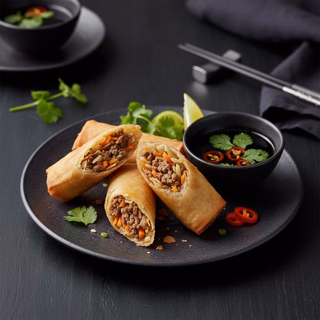 Vårruller med oksekjøtt – sprø vårruller fylt med krydret oksekjøtt.