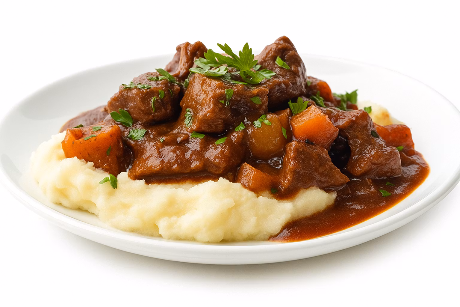 Opplev den klassiske smaken av det franske kjøkkenet med vår Boeuf Bourguignon, en rik og fyldig gryterett laget med mørt oksekjøtt, sakte kokt i en smakfull rødvinssaus. Denne tradisjonelle retten er fylt med aromatiske grønnsaker som gir dybde og kompleksitet til smaken. Serveres med kremet potetmos, som tilfører en myk og tilfredsstillende kontrast til den robuste gryteretten.